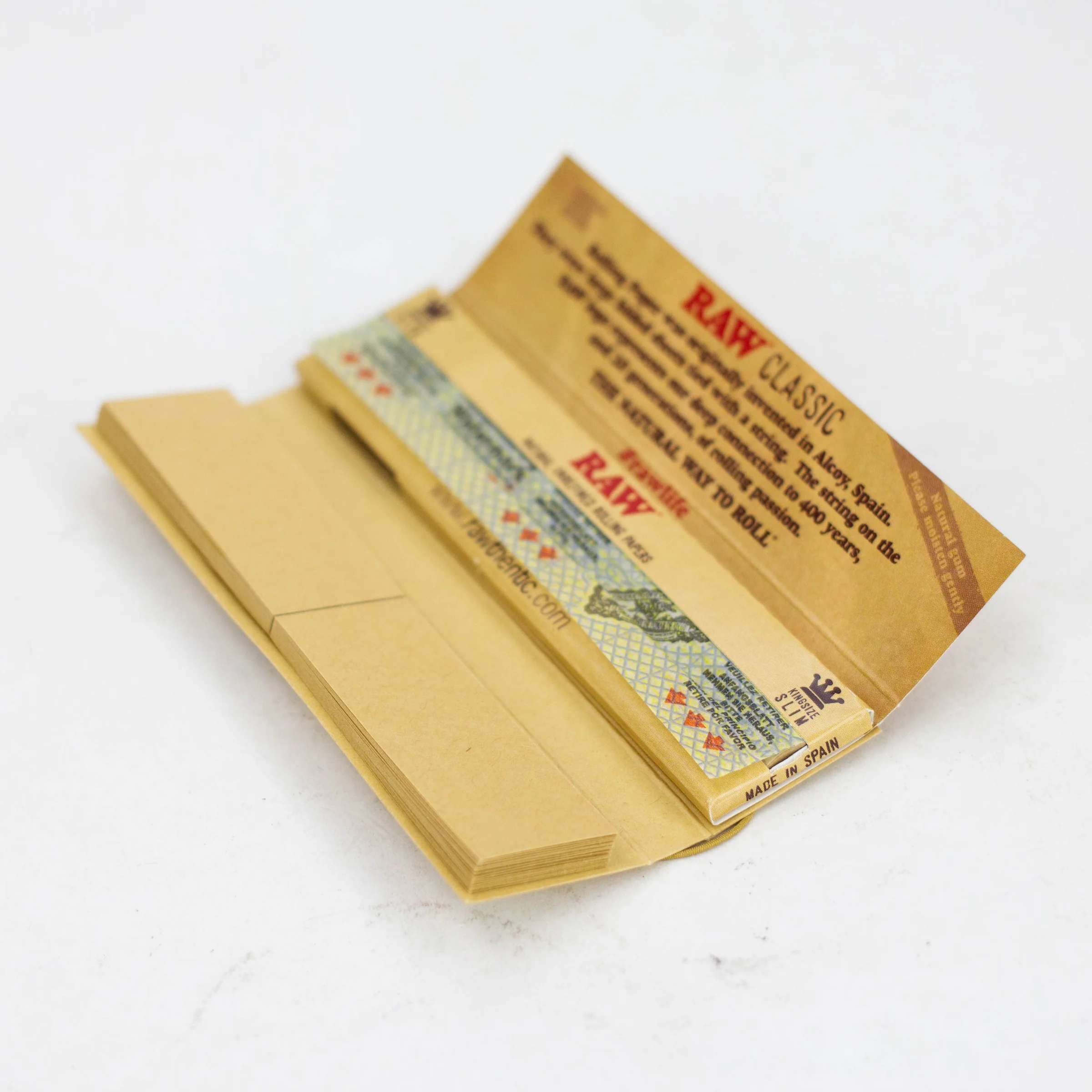 RAW Classic Connoisseur King Slim Rolling Papers are constructed from a proprietary blend of unrefined fibers with no chalk or dyes added, boasting a watermark criss-cross imprint to ensure an even, slow-burning smoke.